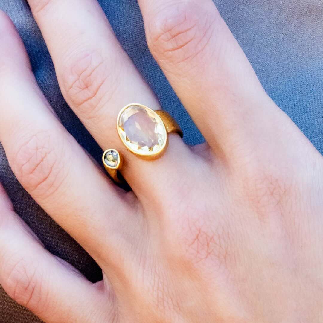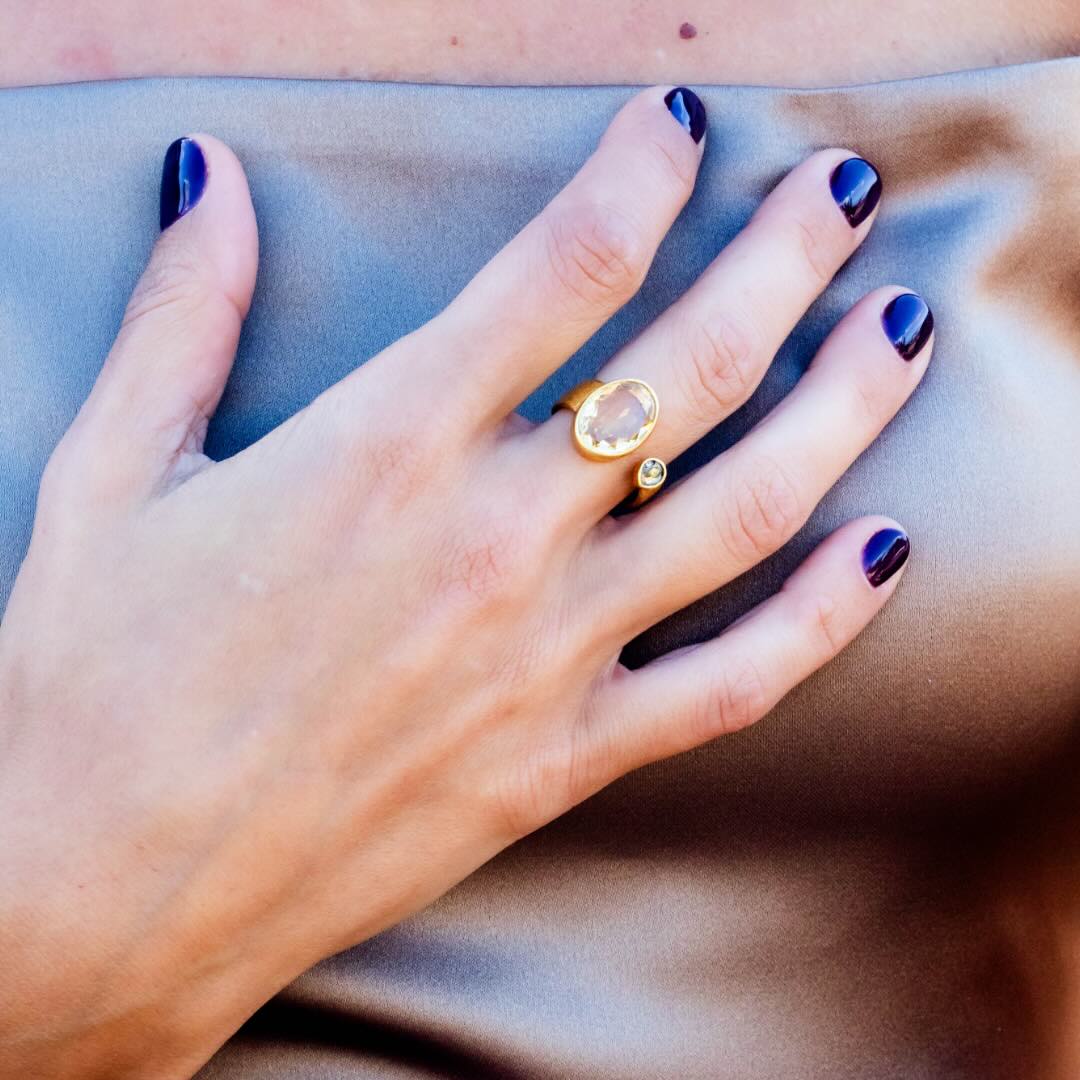 Bague en argent plaqué or, citrine et diamant gris (poivre et sel)