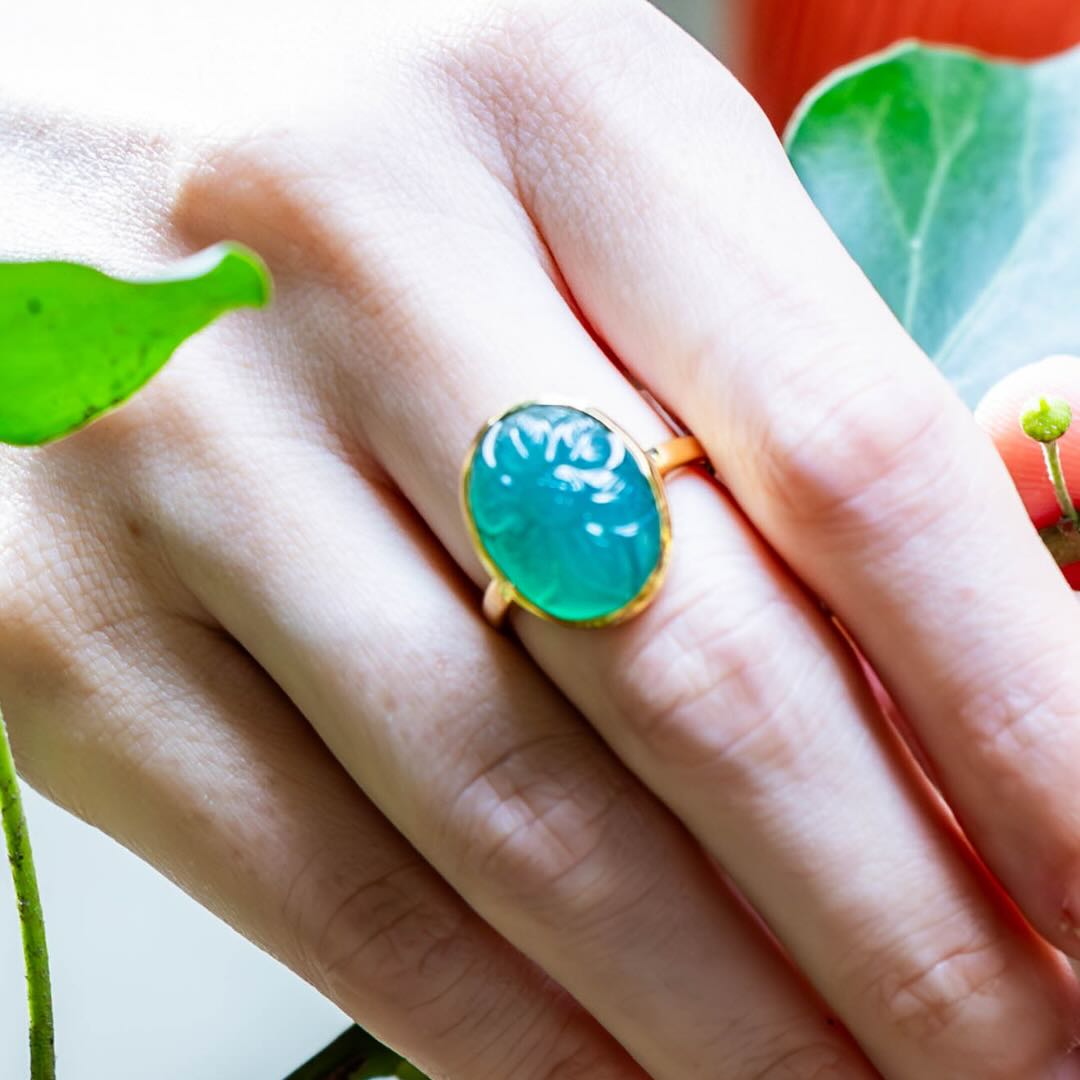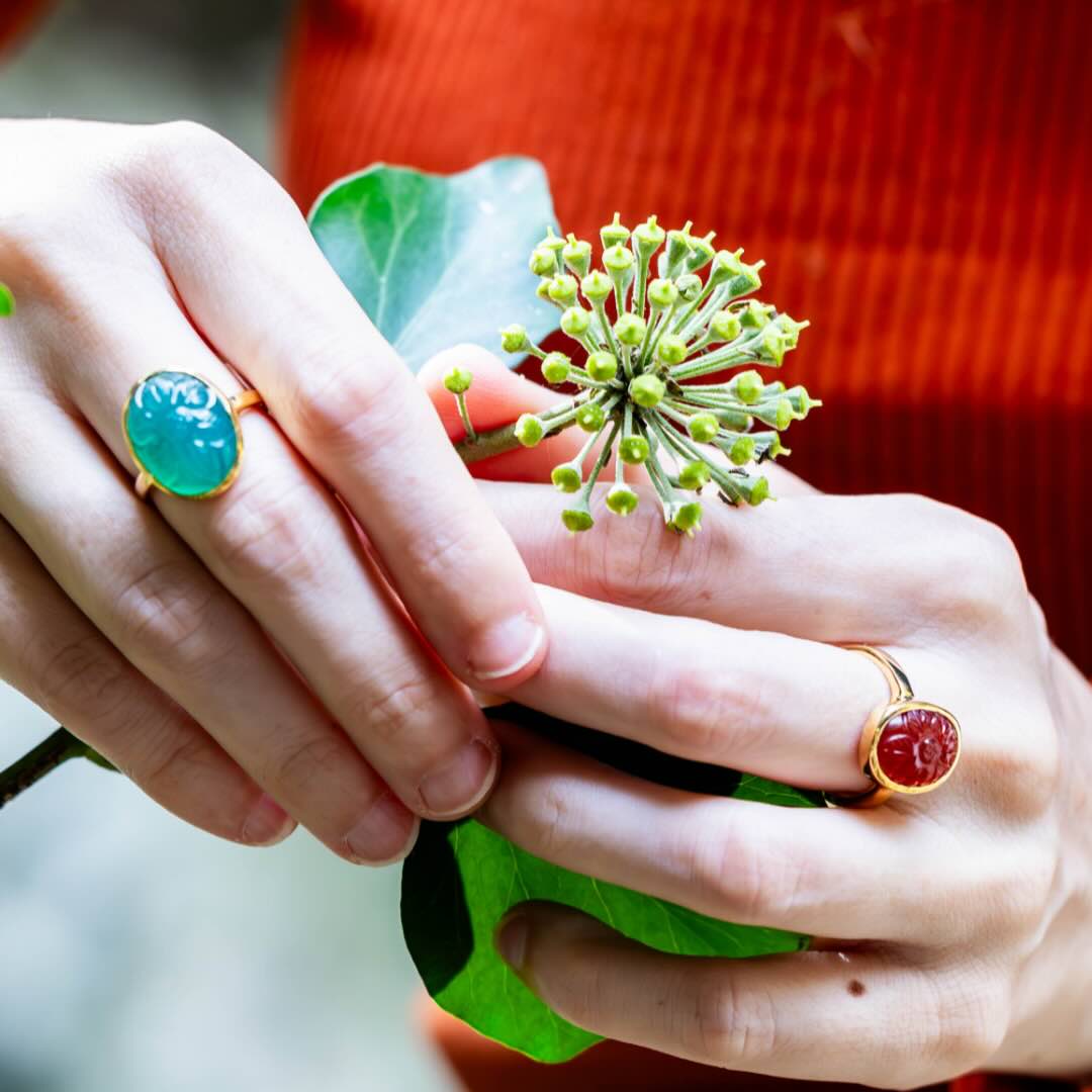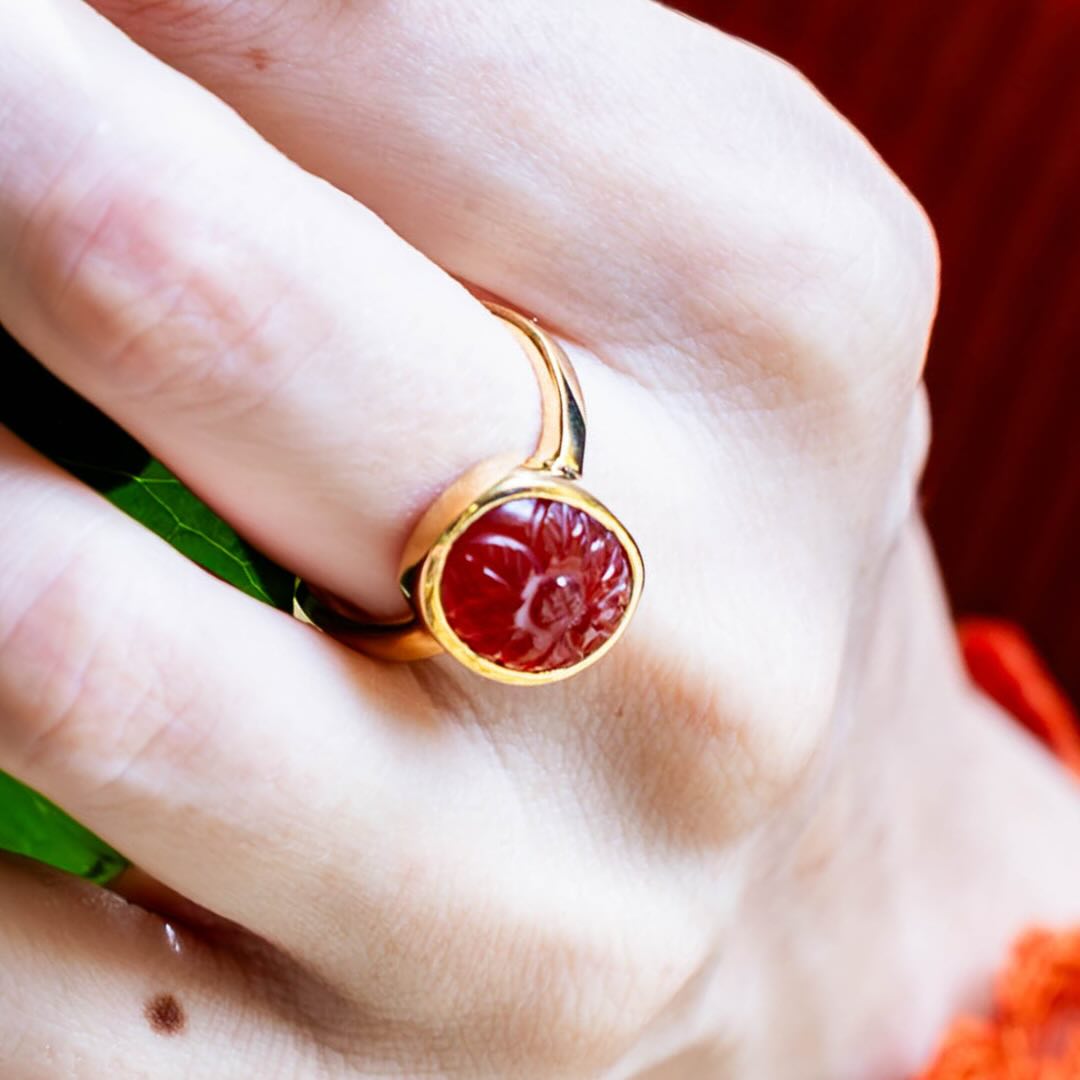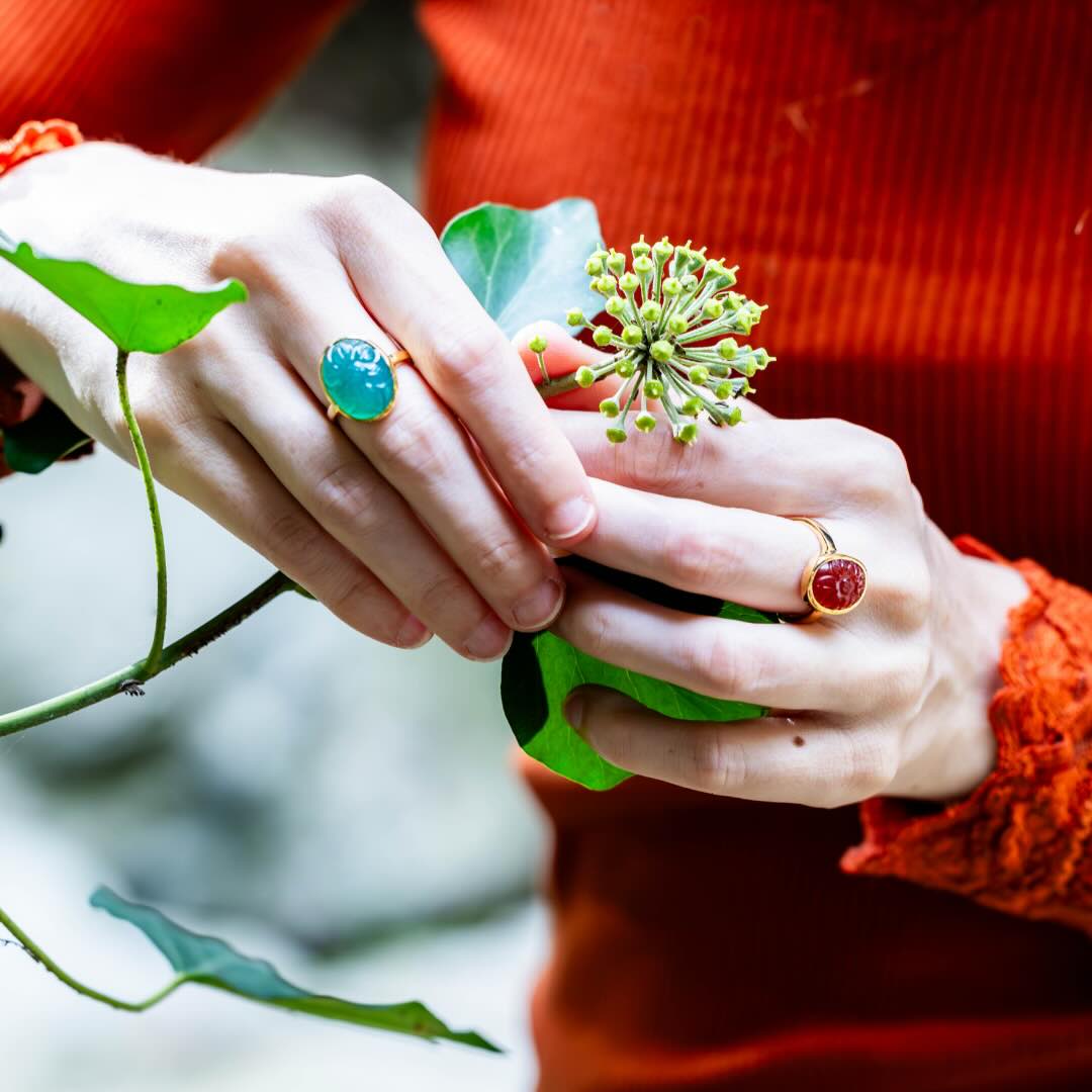 Bague en argent plaqué or, et cornaline & onyx vert gravé