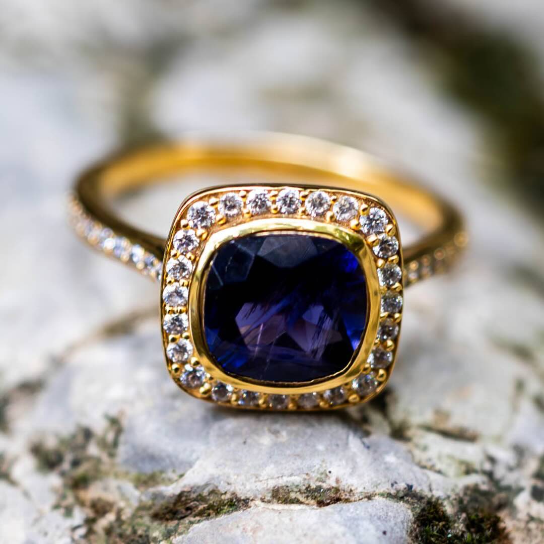 Bague en argent plaqué or avec une iolite bleue-mauve carrée et des petits zircons