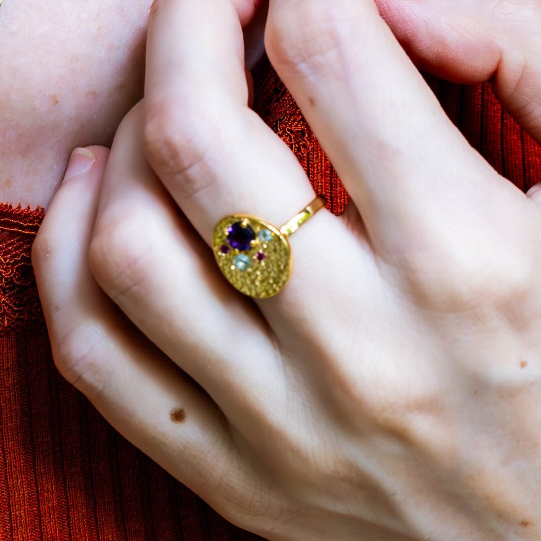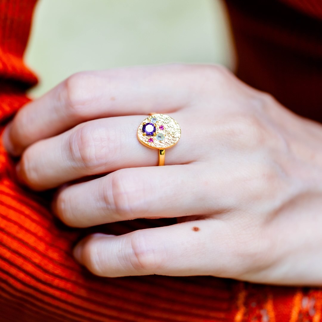 Bague en argent plaqué or, amethyste et zircon