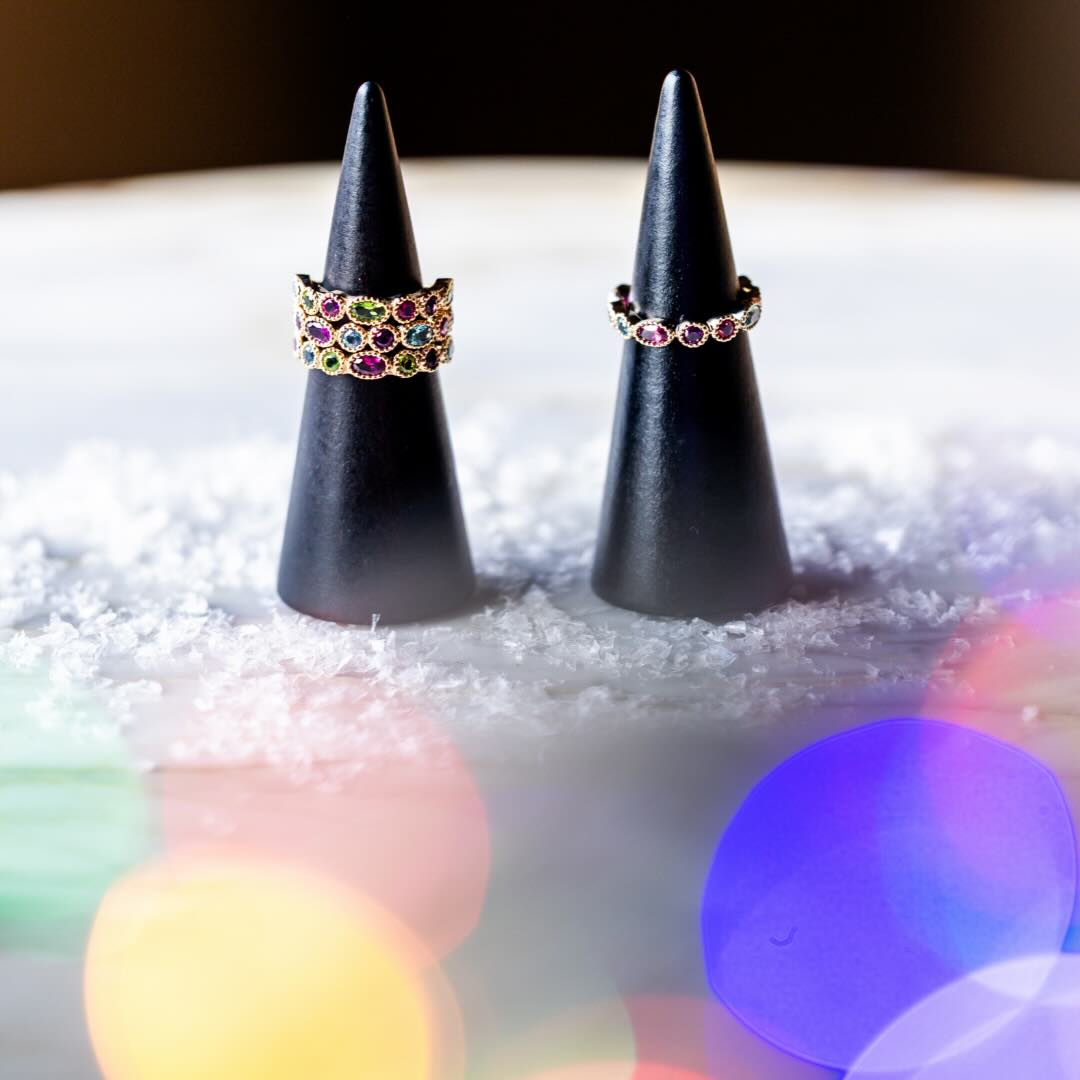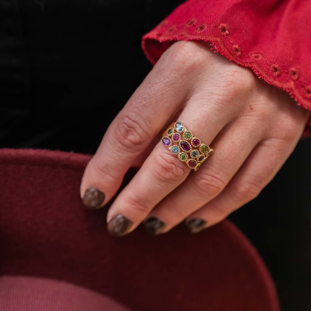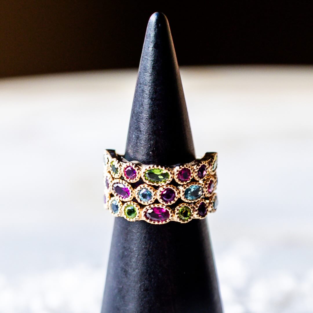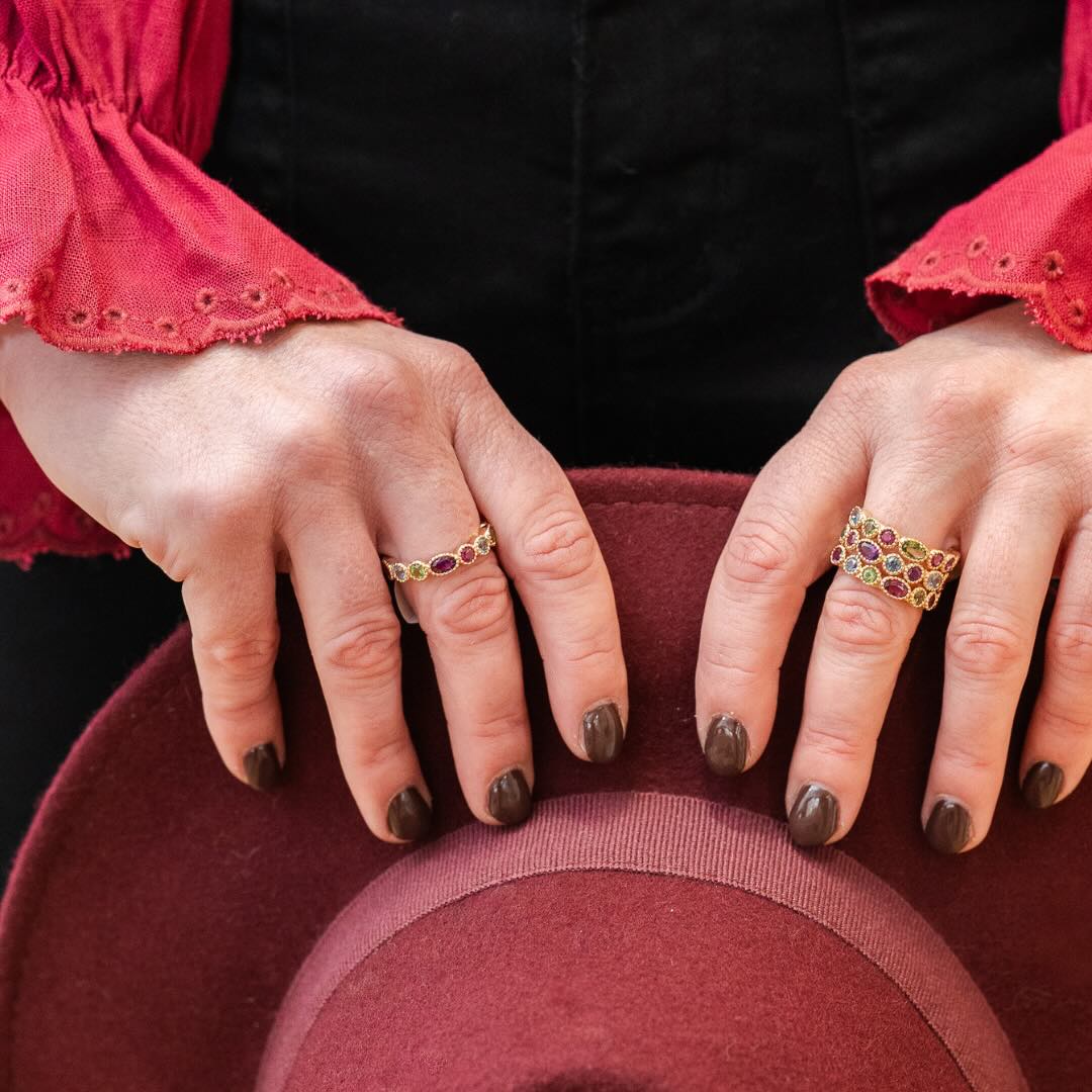 Bague en argent plaqué or et zircons rose, mauve, vert et bleu
