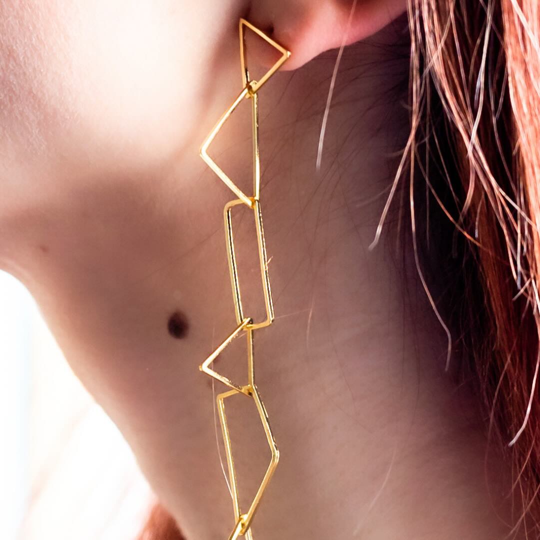 Longues boucles en argent plaqué or avec une cascade de forme géométrique