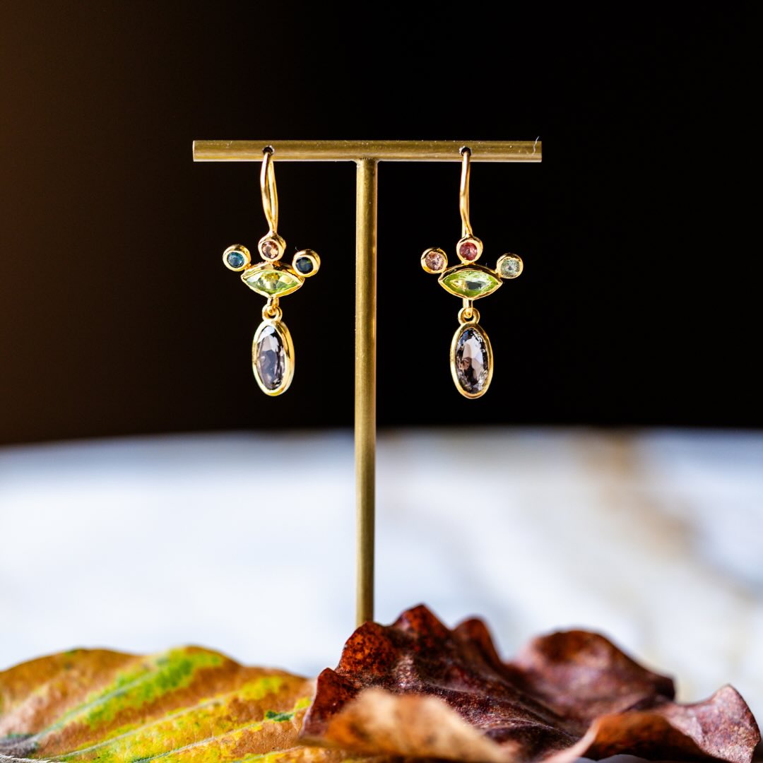Boucles en argent plaqué or, tourmalines de différentes teintes, péridot, quartz fumé