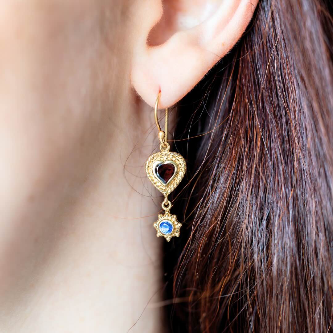 Boucles en argent plaqué or, grenat et iolite