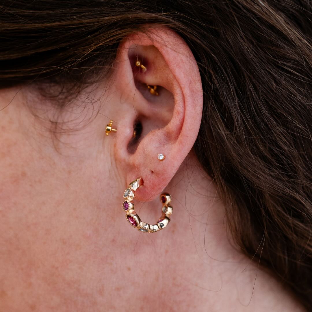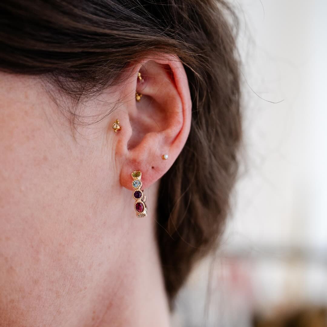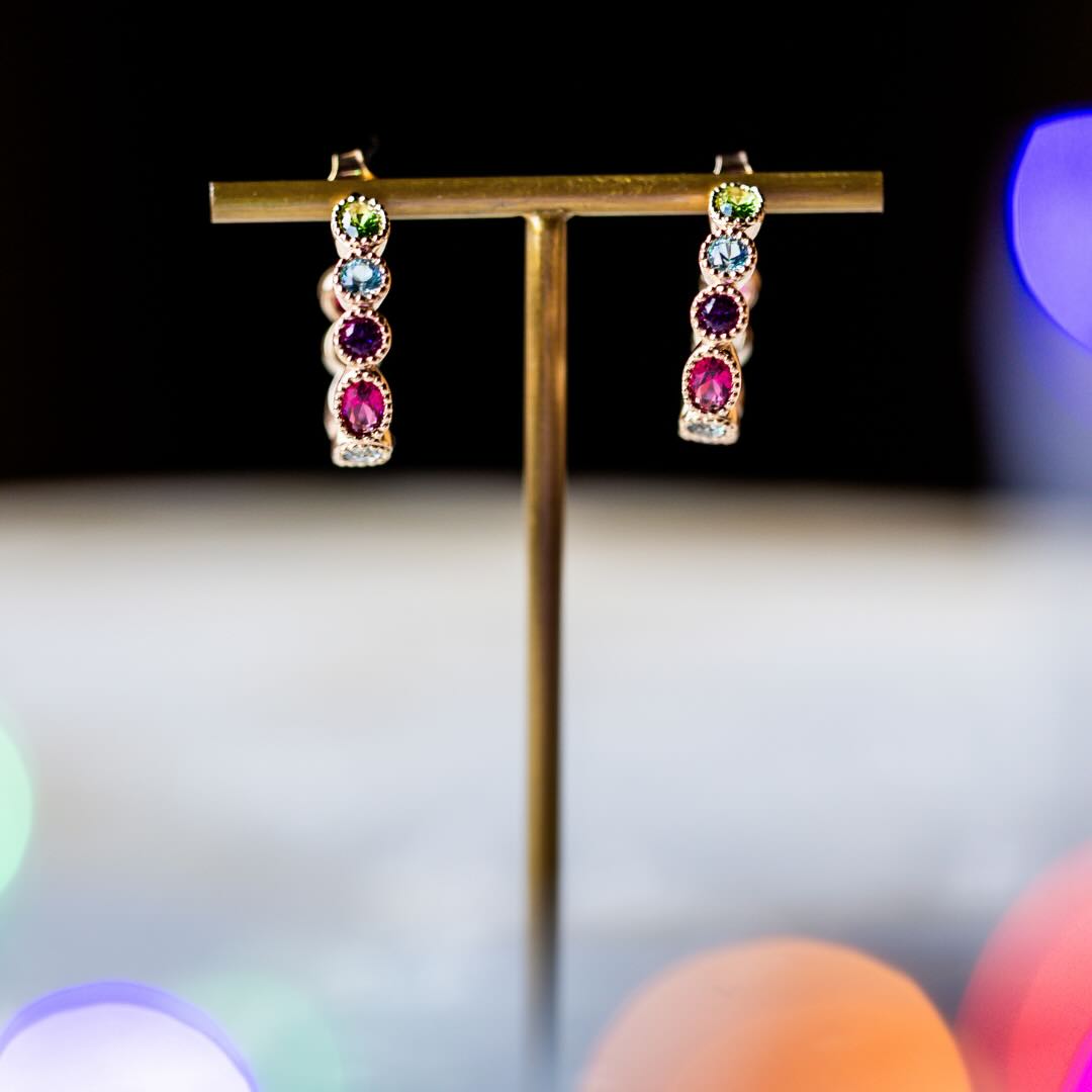 Boucles en argent plaqué or et zircons rose, mauve, vert et bleu