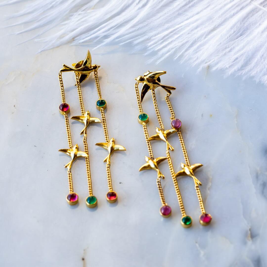 Boucles en argent plaqué or avec des hirondelles et des tourmalines vertes et roses