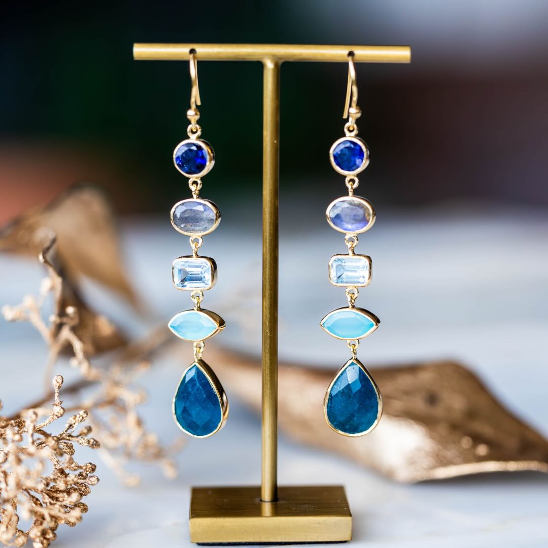 Boucles en argent plaqué or avec pierres semi-précieuses dans les tons de bleu