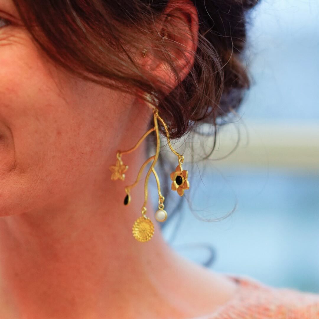 Boucles plaqué or, onyx, perle