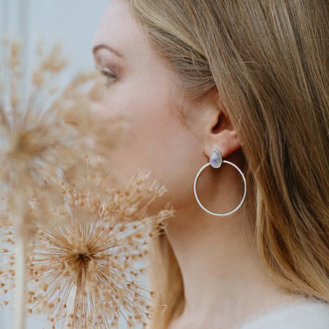 Boucles en argent avec pierre de lune en forme de goutte sur l’oreille