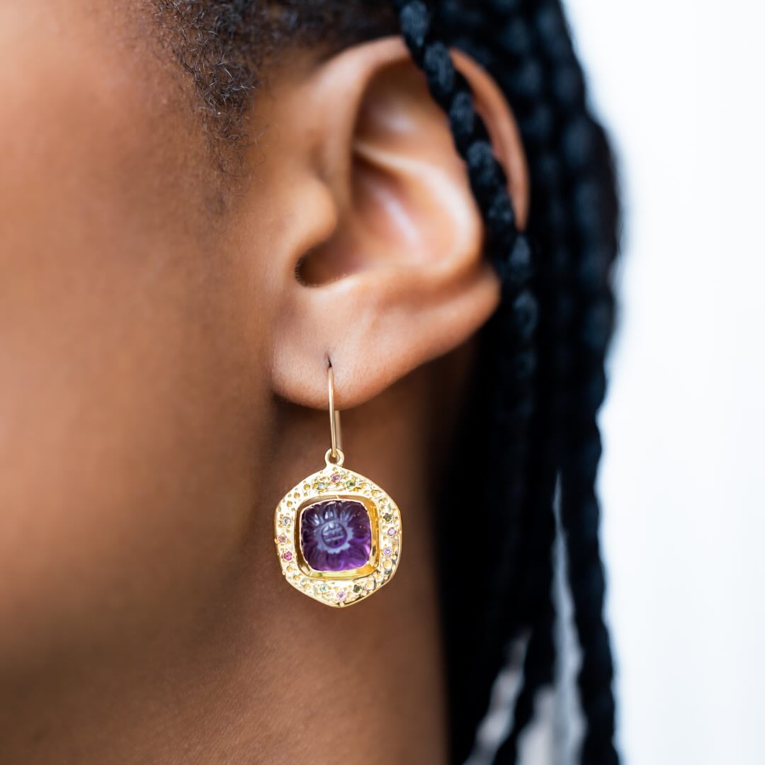Boucles en argent plaqué or, améthyste gravé et zircon multicolore