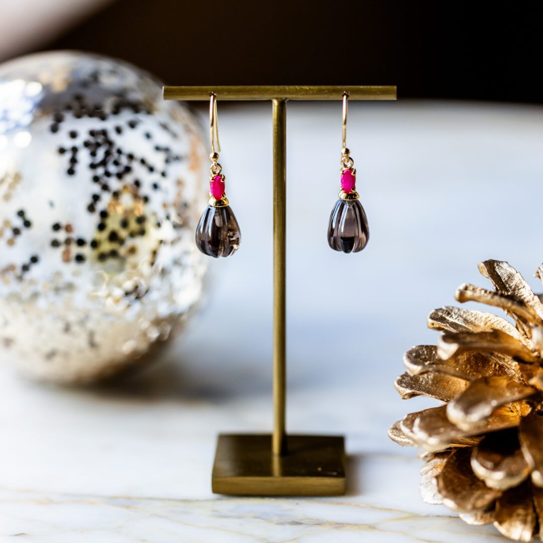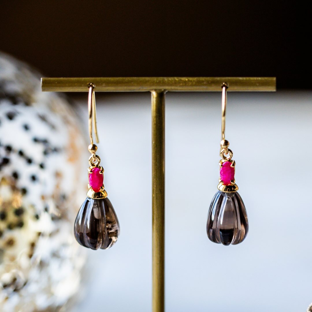 Boucles en argent plaqué or, racine de rubis et quartz fumé gravé