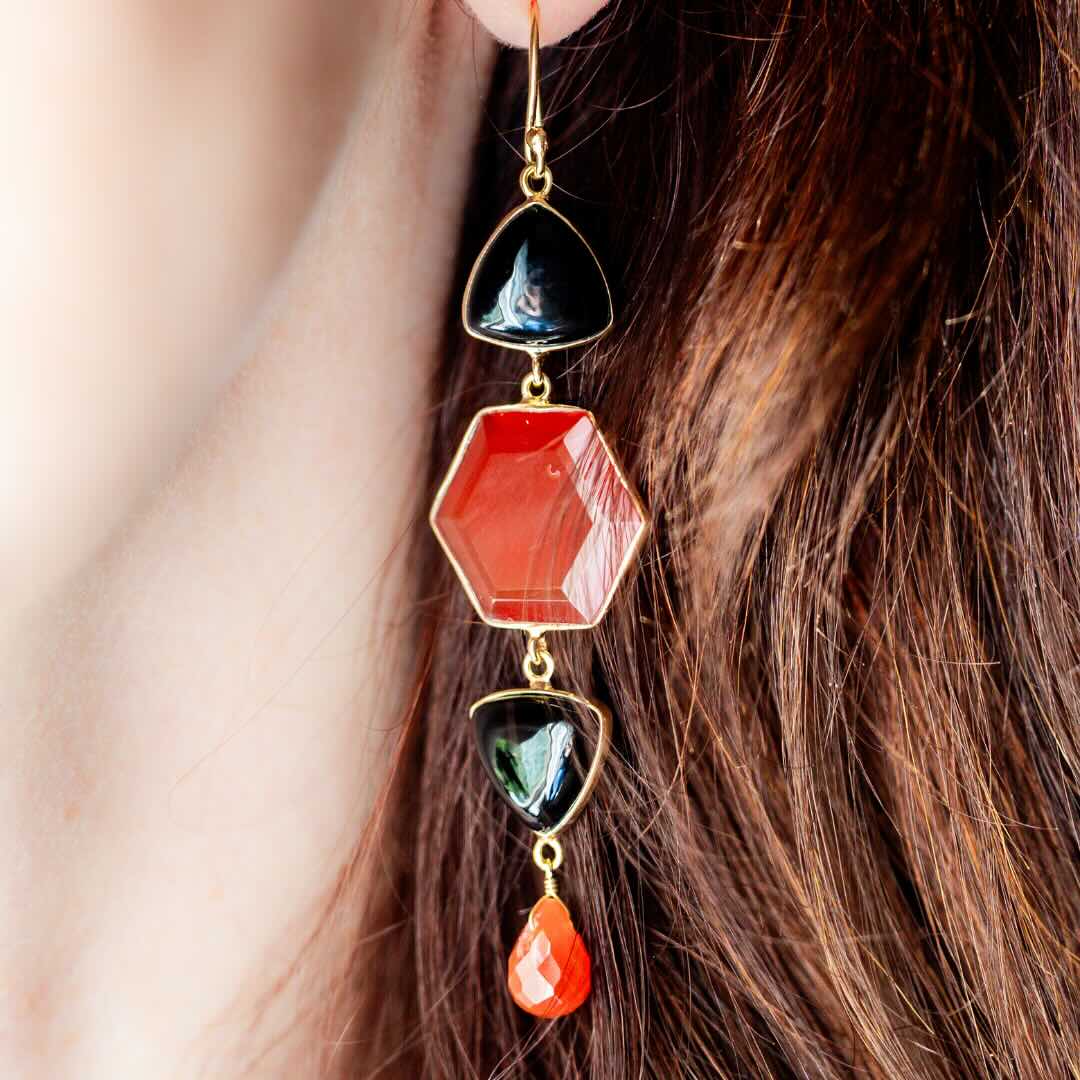 Boucles en argent plaqué or avec un duo d’onyx et de cornaline