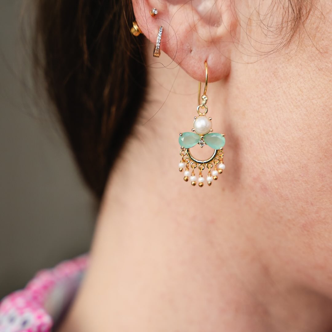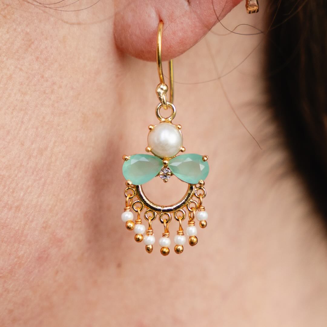 Boucles en ranger plaqué or, calcédoine, perle, zircon