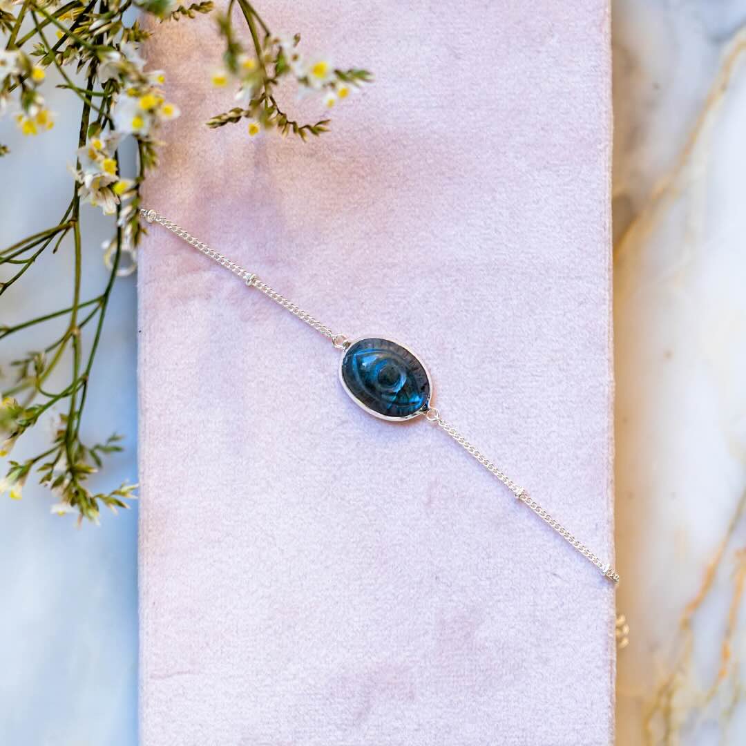 Bracelet en argent avec une labradorite ovale gravée en oeil de protection