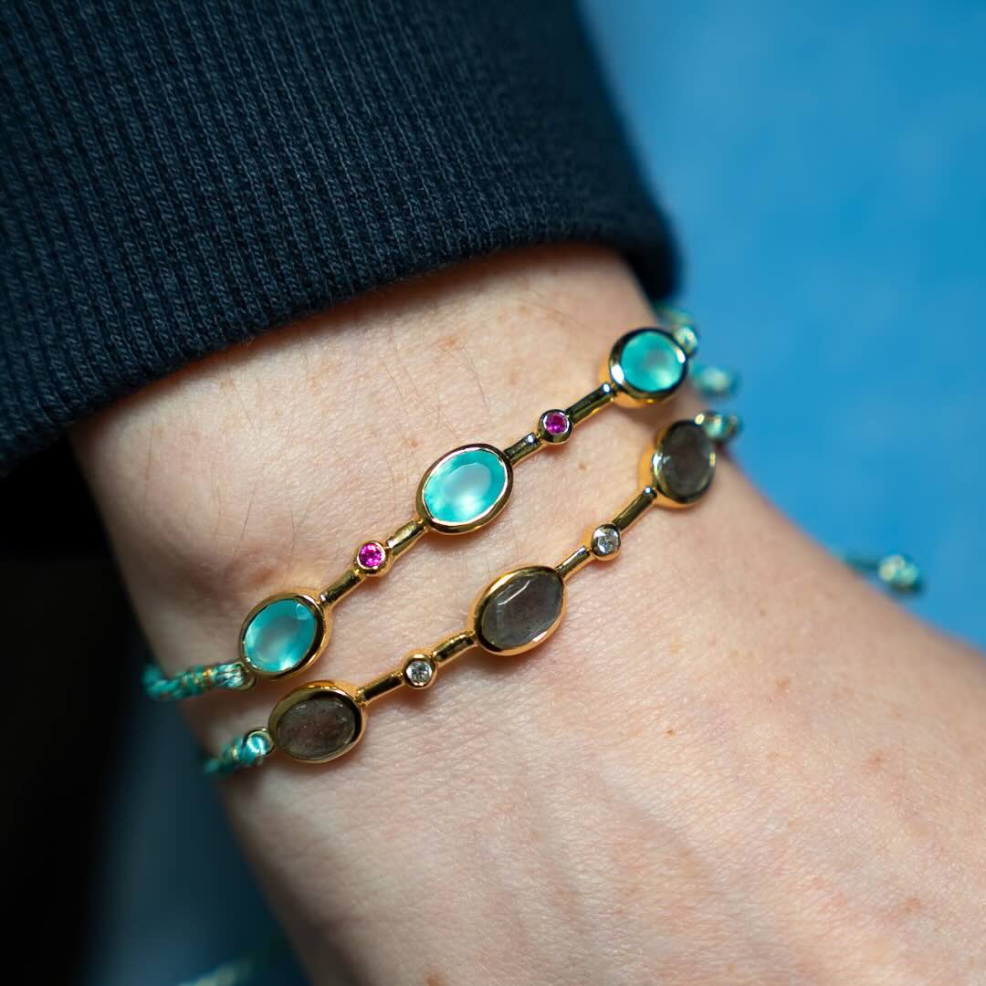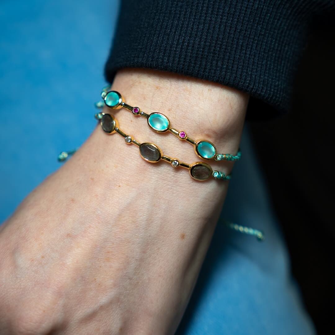 Bracelet en ragent plaqué or, corde et pierres semi-précieuses
