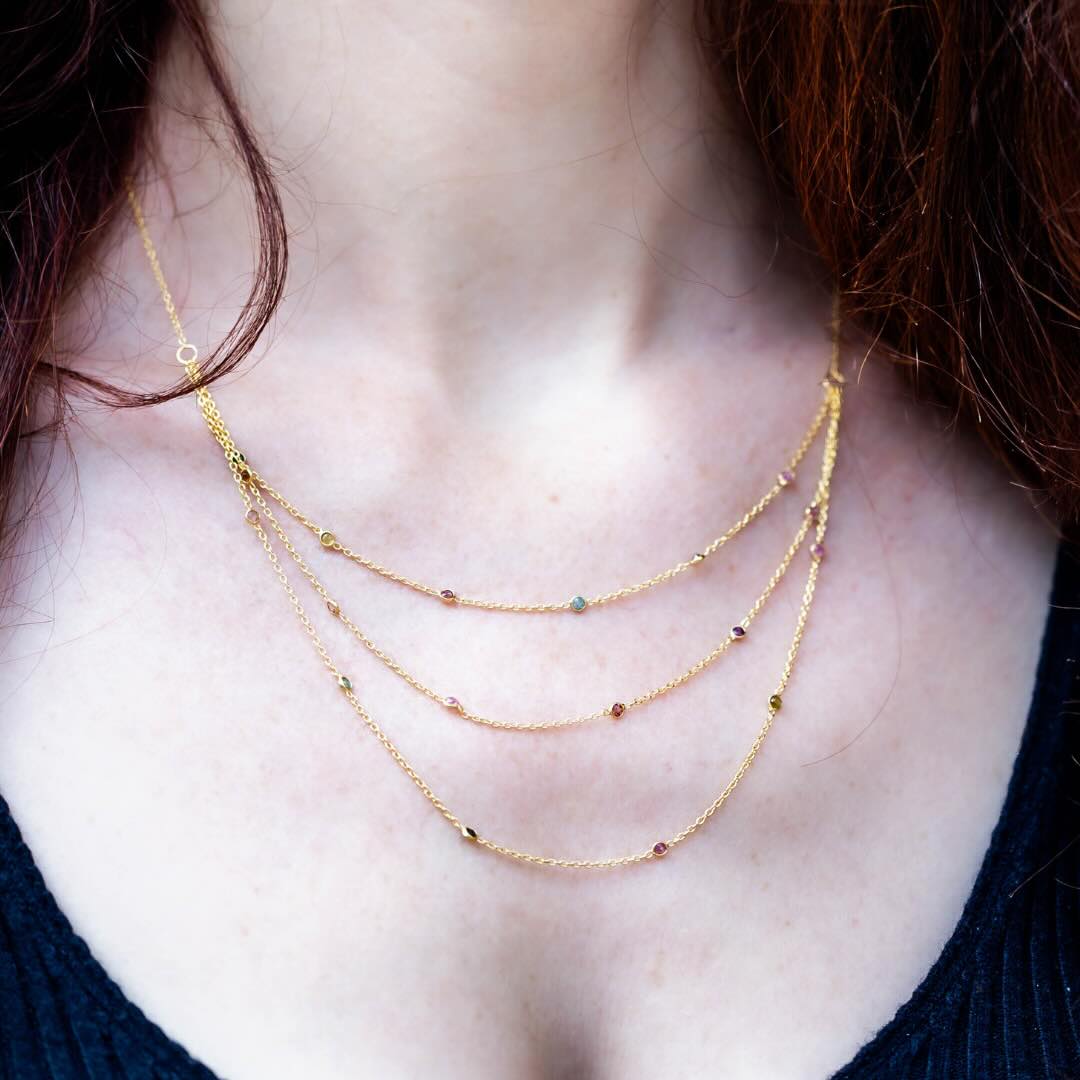 NOTE : les tourmalines sont des pierres dont les tons varient entre le rose, vert, gris, orange, bleu… Le bijou commandé peut avoir une combinaison de teintes différentes que celui de la photo