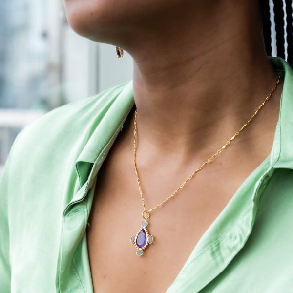 Collier en argent plaqué or d’inspiration baroque avec au centre une améthyste et autour quatre apatites bleues-vertes