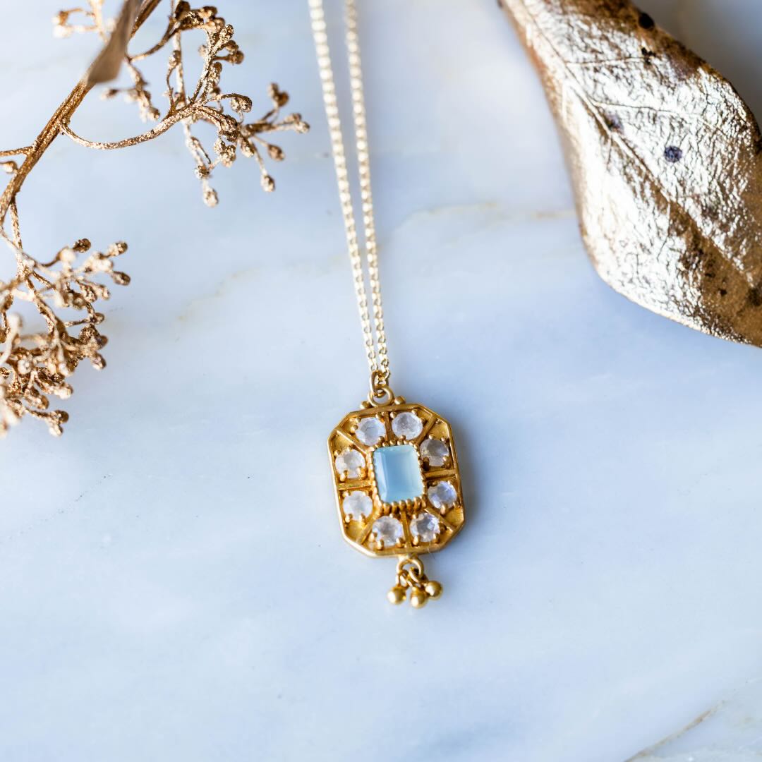 Collier en argent plaqué or avec un pendentif garni des petites pierres de lune rondes et d’une calcédoine au centre